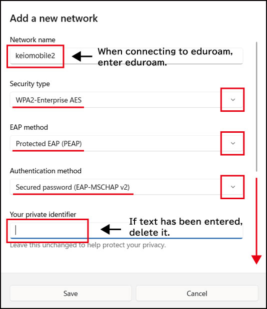 In the keio.jp (Keio ID) case, enter “Wi-Fi user name” and “Wi-Fi password”.