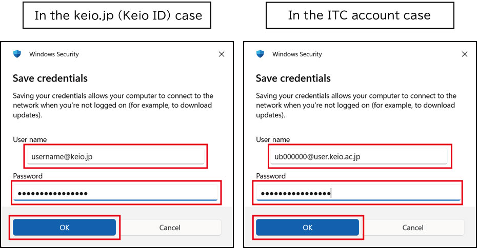 In the case of ITC account, enter, “your ITC account@user.keio.ac.jp” and “Wi-Fi connection password of the ITC account”.