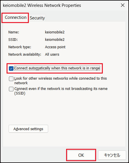Select the [Connection] tab, check the box next to [Connect automatically when this network is in range], and click [OK].