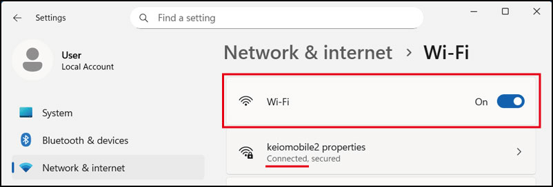 [Network & Internet] - Click [Wi-Fi], and confirm that keiomobile2 is displayed as [Connected].