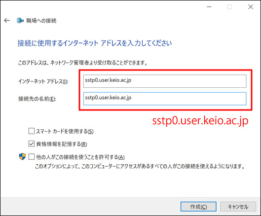 [インターネット アドレス] と [接続先の名前] には“sstp0.user.keio.ac.jp”と入力し,[作成] ボタンをクリックします